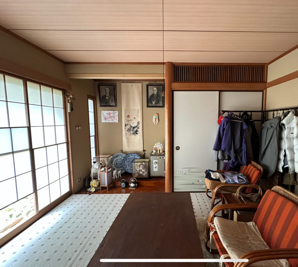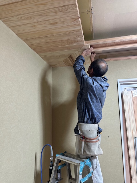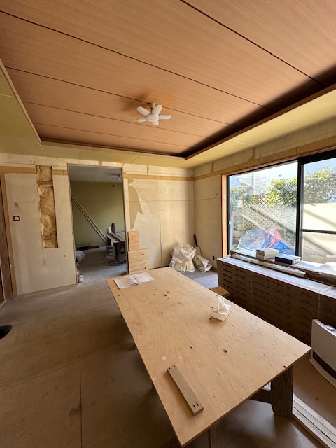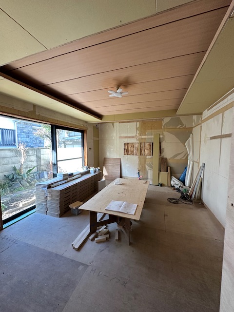 元々和室でしたが、今回のリフォームで和モダンなLDKにやりかえている。既存の天井板貼りは残すなど工夫しながらも新しくつくりあげていく、隣の部屋との壁に一部開口をあけて、ふた部屋を繋げるなど耐震性にも配慮しながら改修中