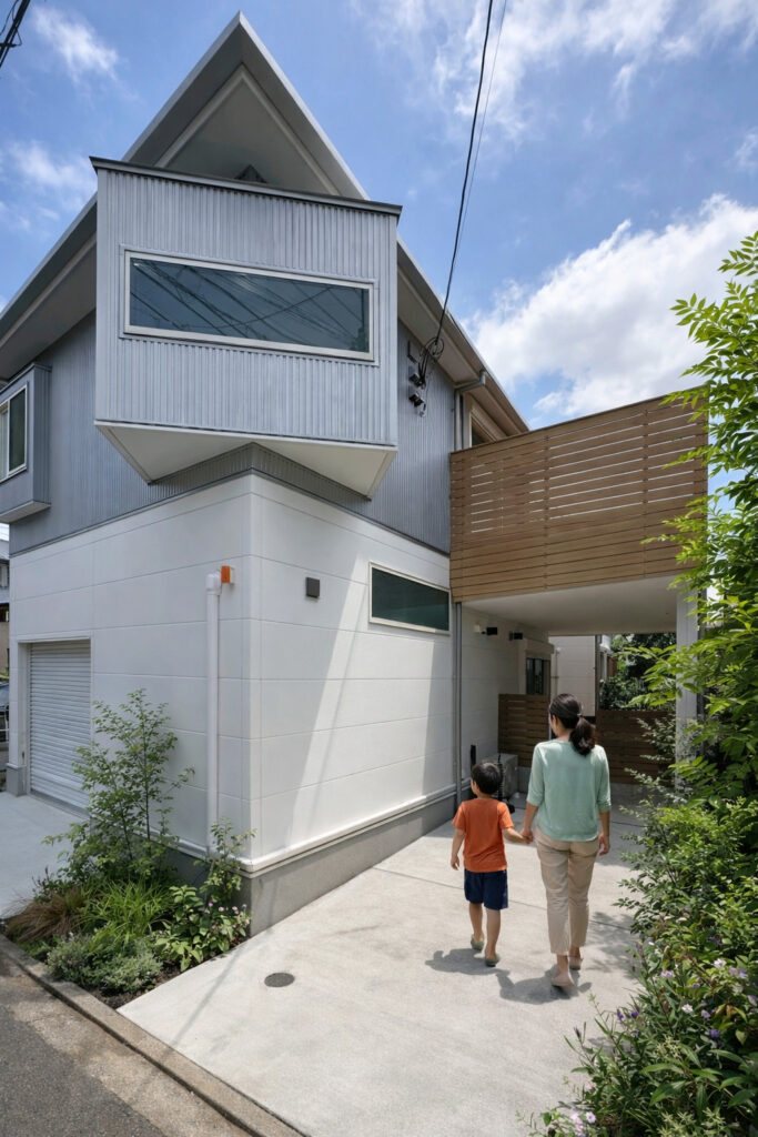 大田区で完成した二世帯住宅ビルトインガレージ付き方形屋根の家