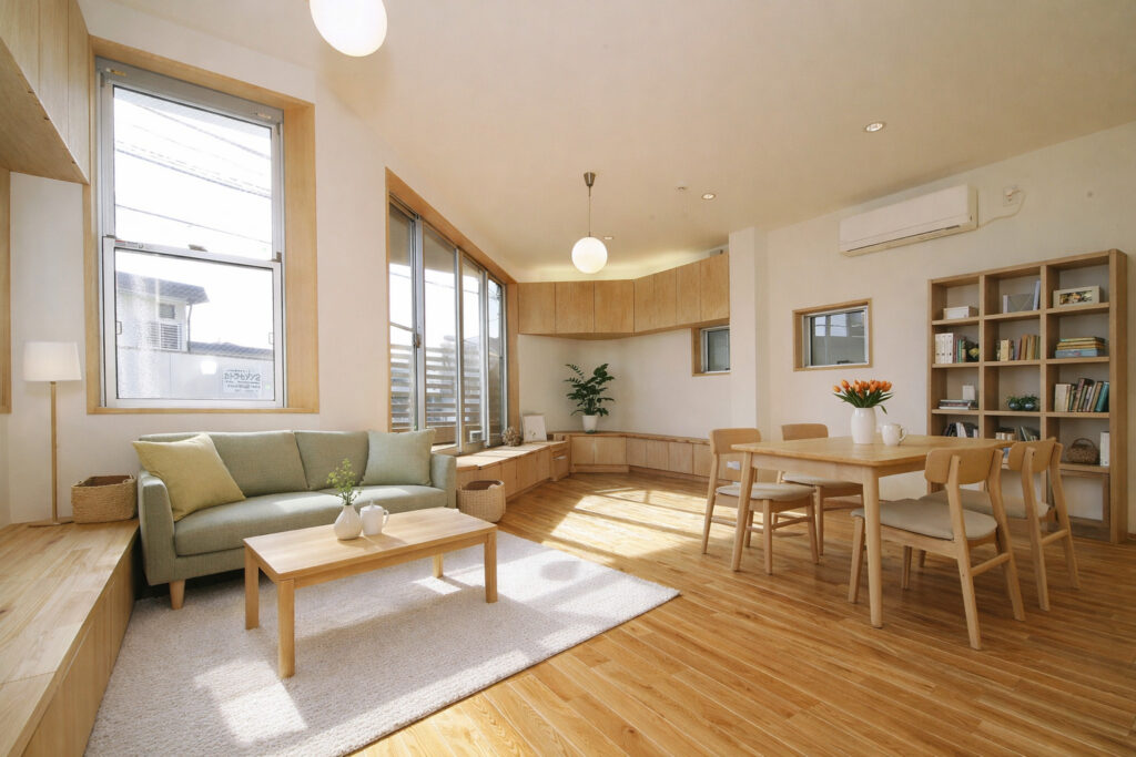 リビングダイニングをグルっと囲むように造りつけのベンチ式収納を設置