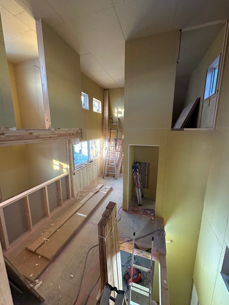 通常なら1日か2日で上棟(木の柱や梁を組み上げる作業)するのが一般的ですが、この家は少々複雑な構造体で4日くらいかかりましたとさ。