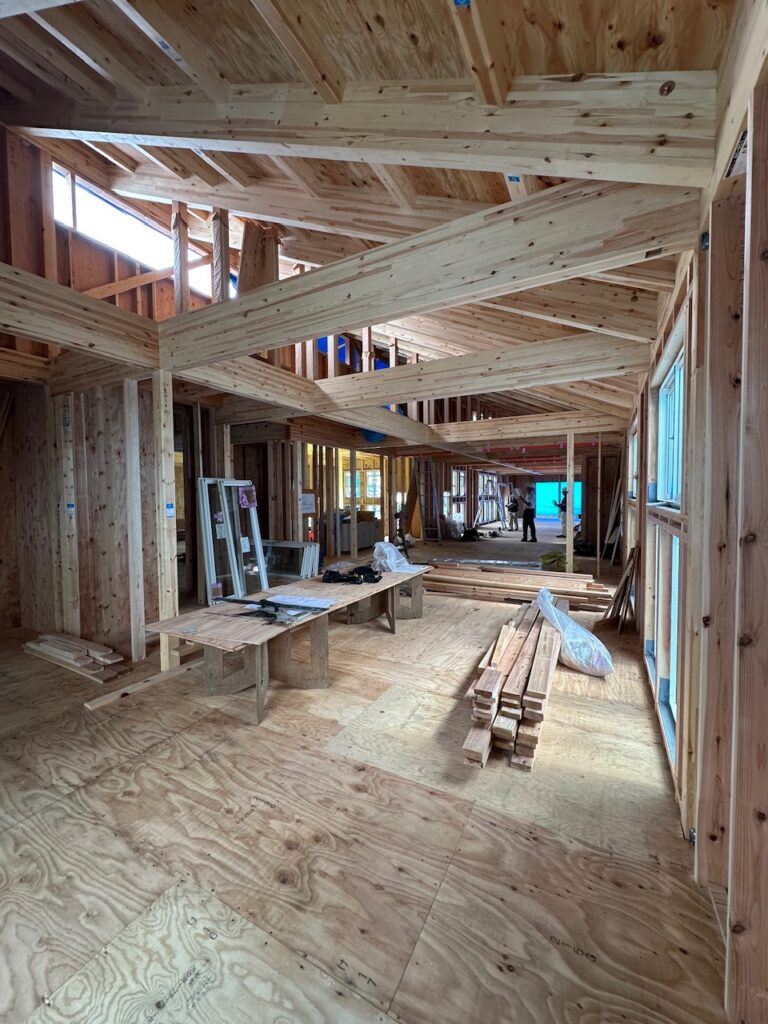 園舎内外には楽しい仕掛けもいっぱいでこれから本格的な木工事を迎える。2階の保育室には吊り遊具も設置される予定で楽しい木造園舎になれば幸いです。