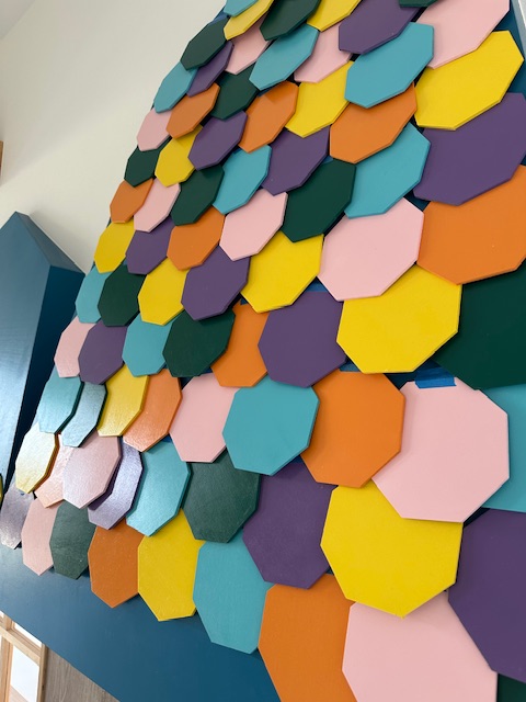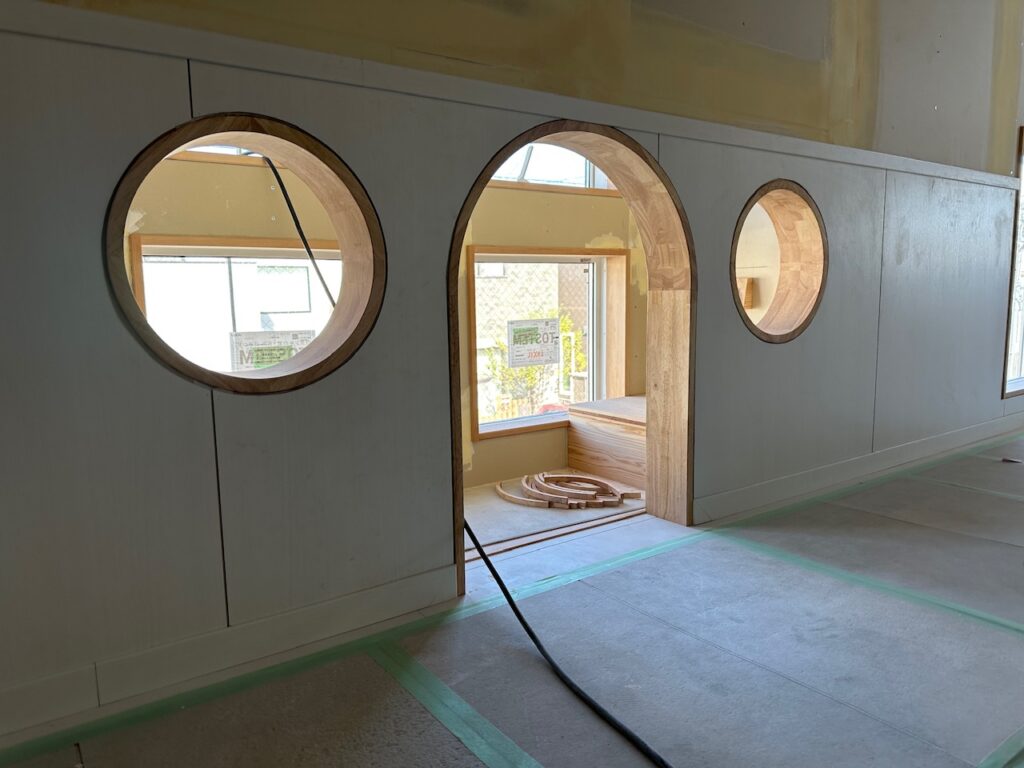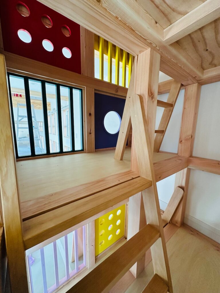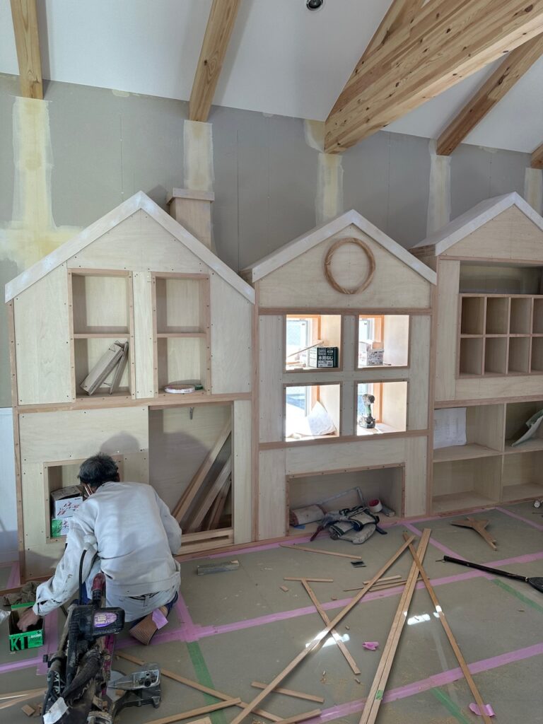 家型の本棚、飾り棚部分の仕上げ段階を迎えております。保育室内には 他に小上がり畳コーナー、少人数で楽しい小さな小屋、出窓風ベンチコーナーなど園児にとって楽しい居場所が点在。