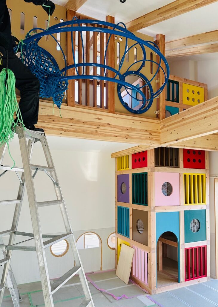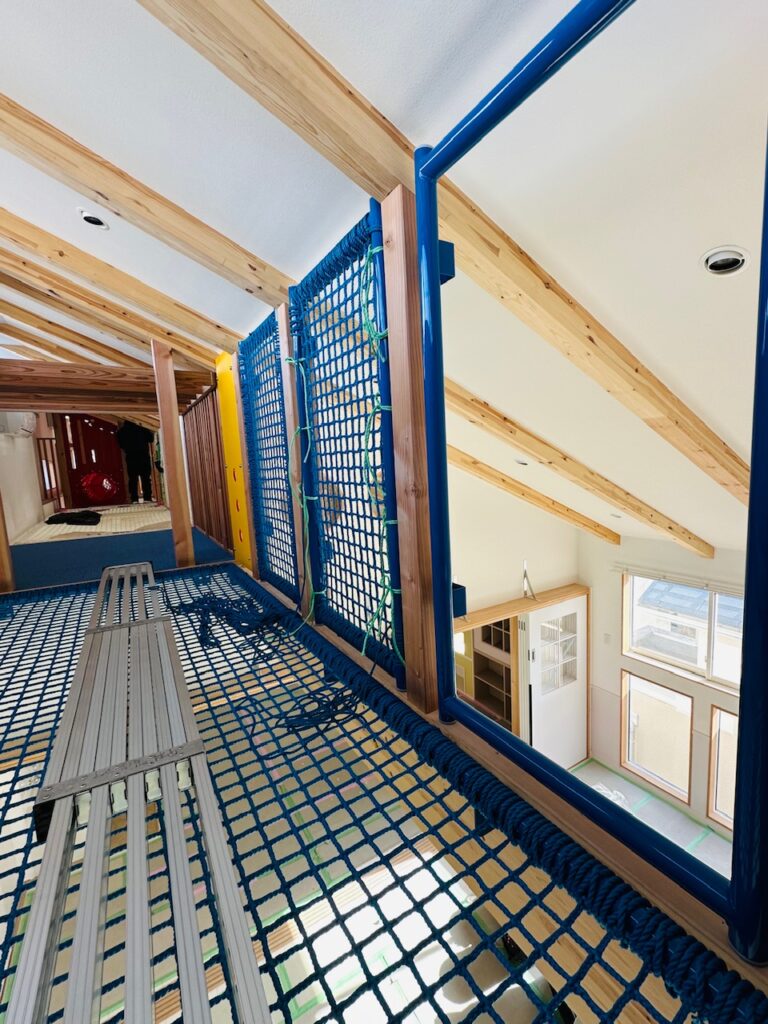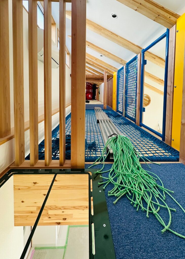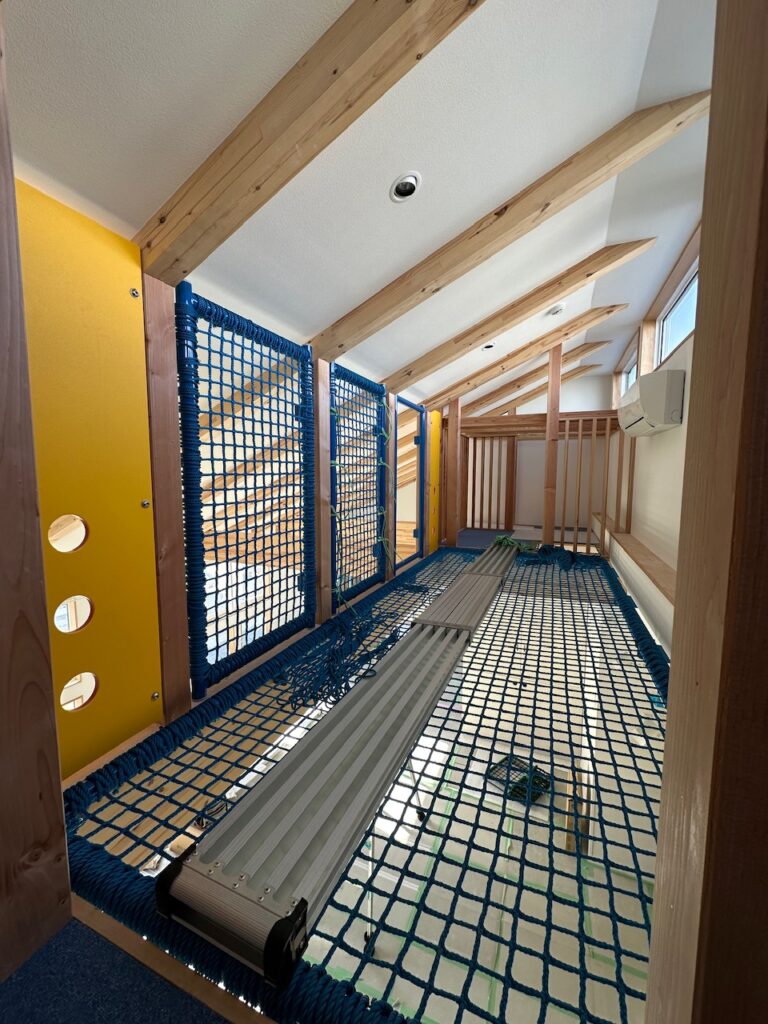 勾配天井の吹抜け空間を利用した 大規模なネット遊具も併設される予定で、雨などの時に思い切り体を動かせる場所も用意している。様々な保育に対応した保育園を目指している