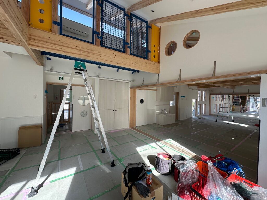 東村山市で木造の福祉施設=100人定員の認可保育園を計画し、春の開園に向けて仕上げの工事中