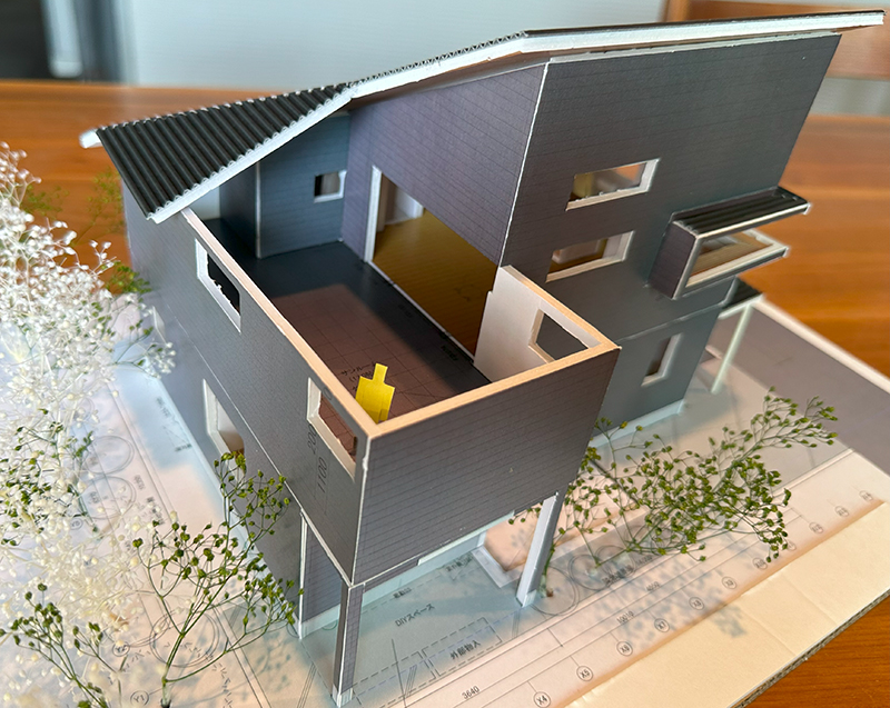 今回計画中の大改造プロジェクトをご紹介 奥の背景の既存一戸建て住宅(築30年程度)をイメージ模型のように大きく減築し、間取りも全面的に大改造するプロジェクトです