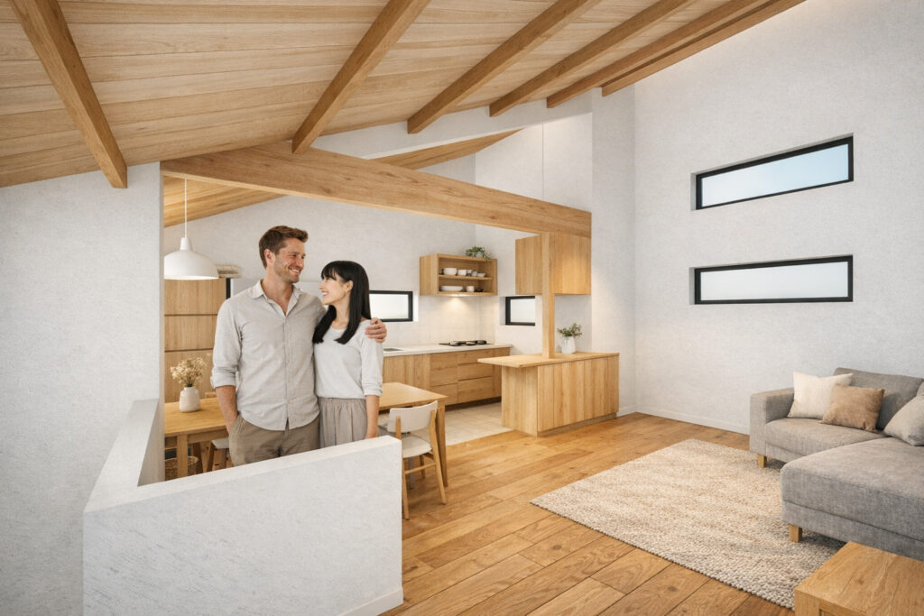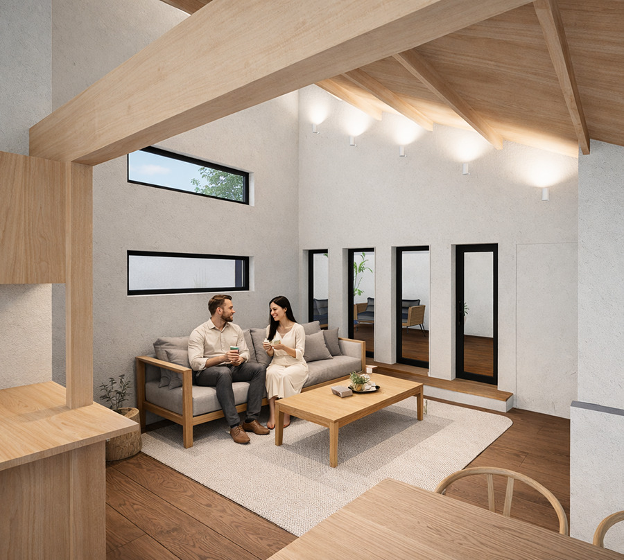 駅近の一等地に古家付き土地を購入し、自分たちの生活スタイルに合わせ改造していく。もともと1階がLDKで2階が個室でしたが、逆に2階を勾配天井のあるLDKへとやり替える