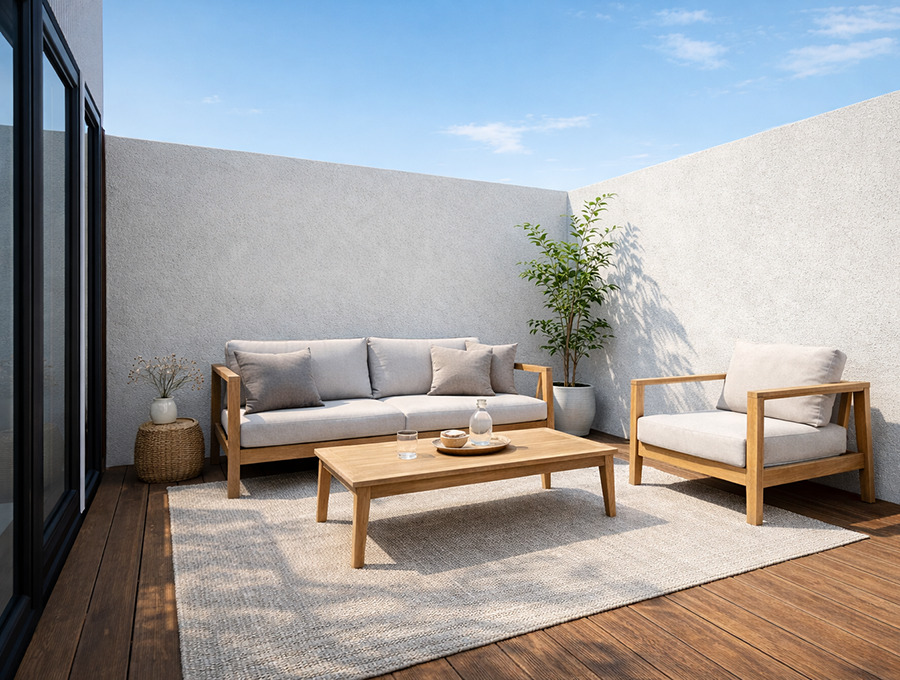 2階の既存の個室だった場所は思い切って外部スペースとして、LDKや浴室サウナと連続するインナーバルコニーへ。プライバシー確保されたインナーバルコニーの様子