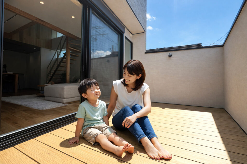 2階に家族みんなが集まるLDKを配置しておりますが、親世帯と子世帯のちょうど間に 公園に面して半分屋根がかかるインナーテラスを設けております。両世帯共同で利用する公園の樹木を感じながらの快適テラスへ