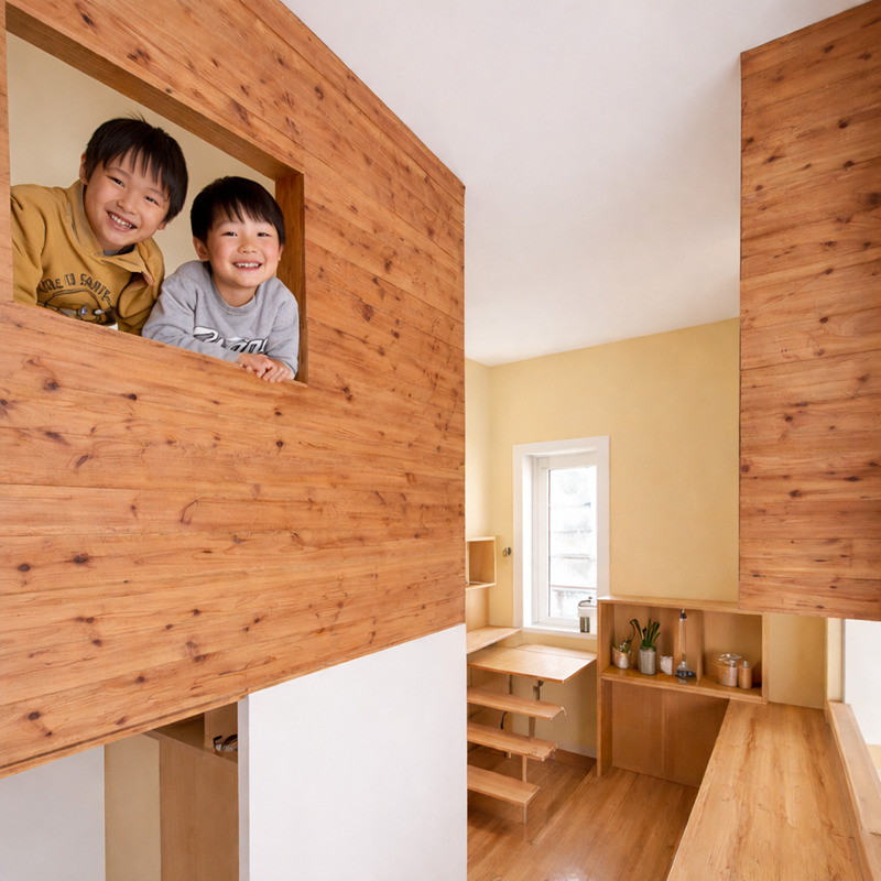 駅前の商店街を抜けた住宅密集地にあり、子育て家族5人のための5層の床レベルで構成された木造3階建ての家です。
