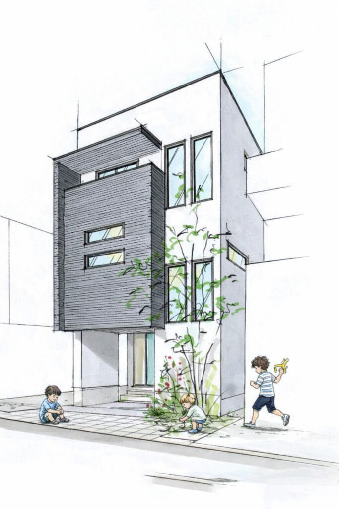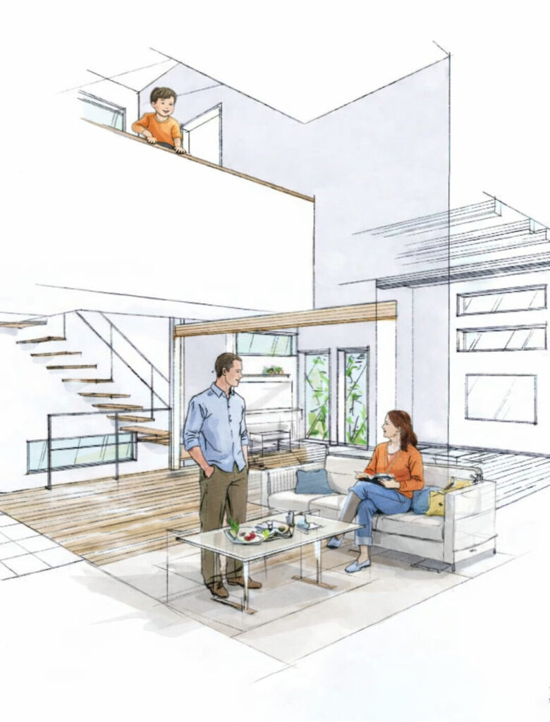 1階にはこども達が描いた油絵等を飾るギャラリーのあるエントランスホールや予備室、2階は家族みんなが集まるLDKや水回り、3階以降はスキップフロア構成で幅が5m以上のデスクカウンターのある勉強ホールや個室が配置され、これらを軽やかな階段が結び、家族がつながる立体的な住まいです