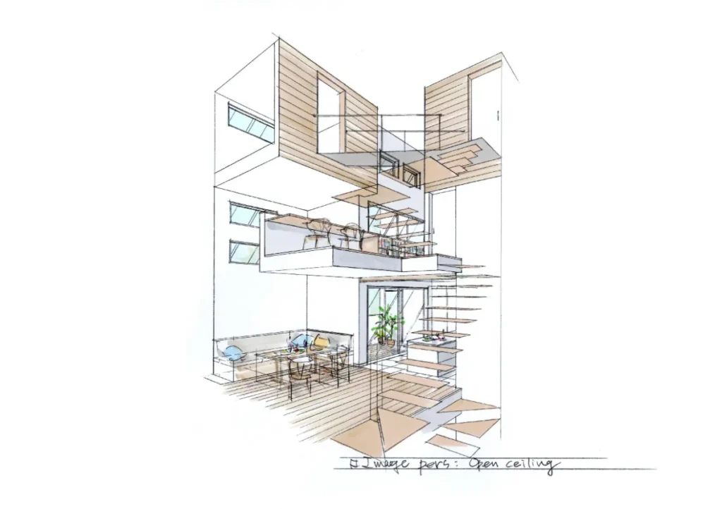 1階にはこども達が描いた油絵等を飾るギャラリーのあるエントランスホールや予備室、2階は家族みんなが集まるLDKや水回り、3階以降はスキップフロア構成で幅が5m以上のデスクカウンターのある勉強ホールや個室が配置され、これらを軽やかな階段が結び、家族がつながる立体的な住まいです。