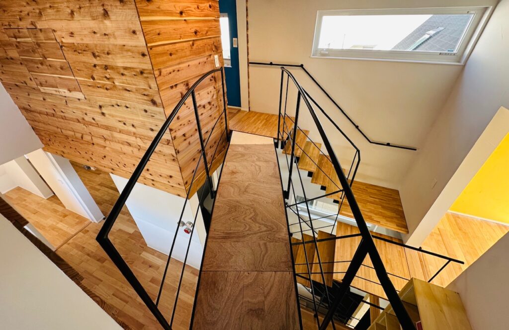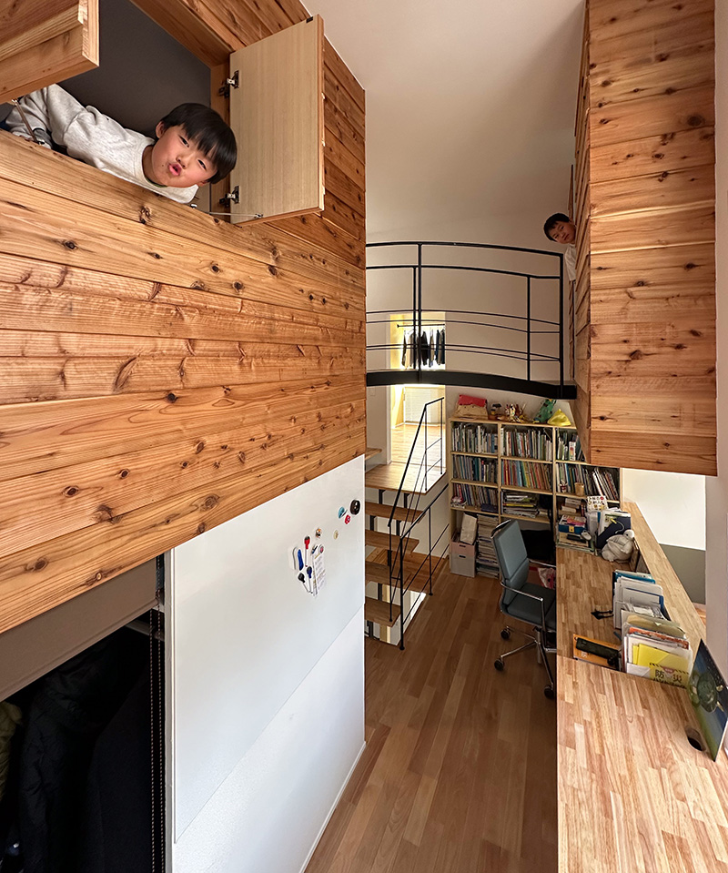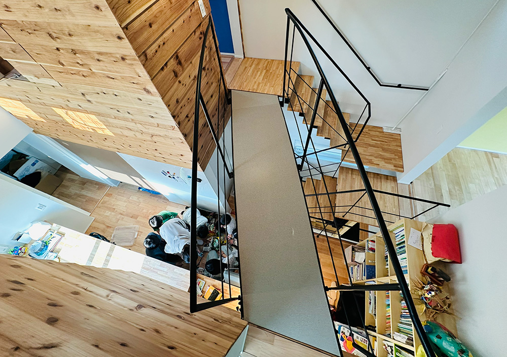 5層フロアとすることで天井の高さに変化をつけた高窓採光や通風を確保し、また吹抜けを介して上下に視線が届き、子どもたちの様子もよくわかります。窓はすべて樹脂サッシュを採用し、断熱性能や気密性能を高め、自然素材の仕上げにもこだわりました