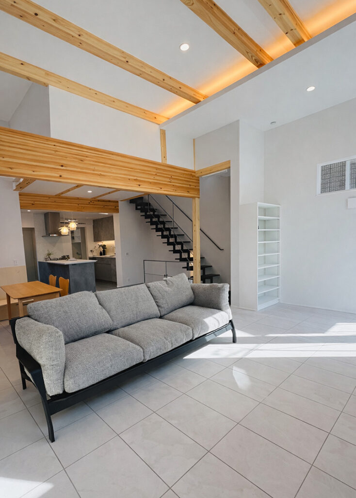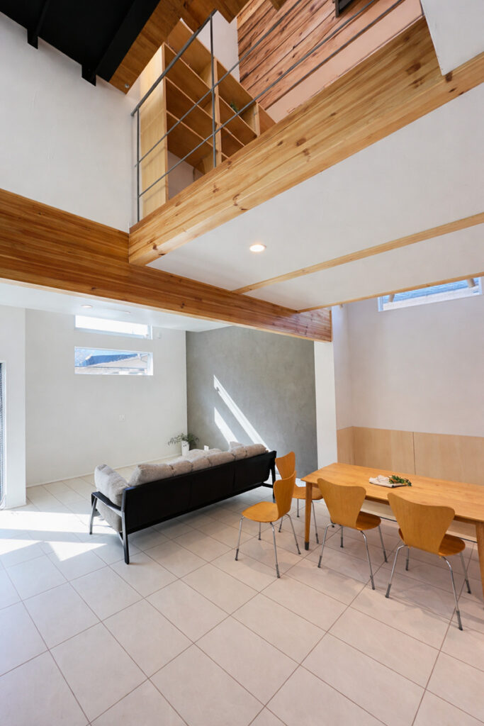 2階の一番日当たりの良い場所に天井も高いリビング(家族が集まる場所)を設定。3階のこども室と吹抜けで繋がったり、リビングの天井高さを上げたり随所に5層効果でております。