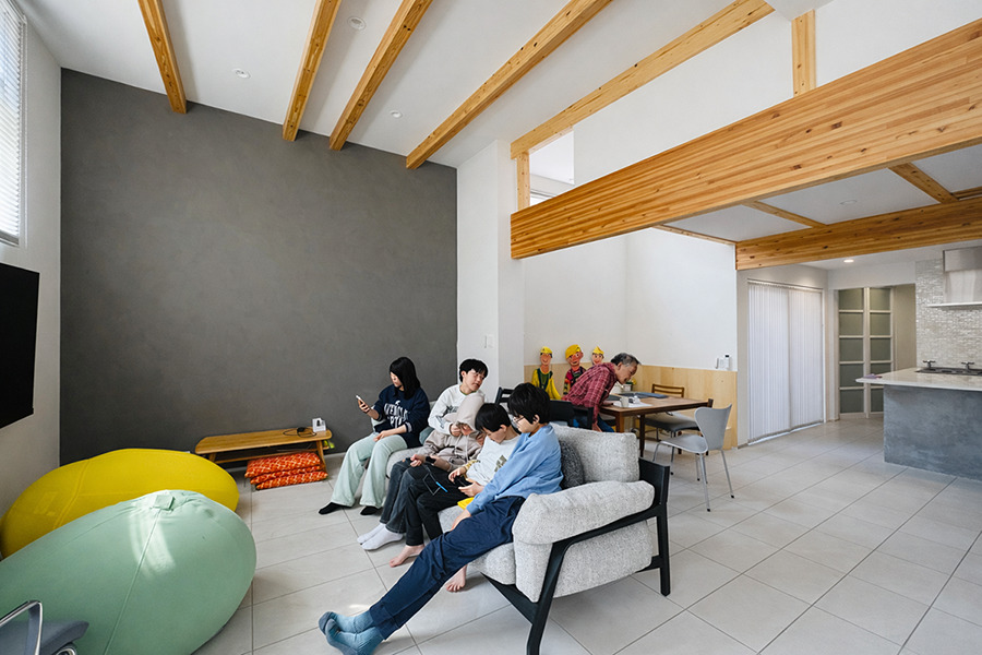 駅前の商店街を抜けた住宅密集地にあり、子育て家族5人のための5層の床レベルで構成された木造3階建ての家です。1階にはこども達が描いた油絵等を飾るギャラリーのあるエントランスホールや予備室、2階は家族みんなが集まるLDKや水回り、3階以降はスキップフロア構成で幅が5m以上のデスクカウンターのある勉強ホールや個室が配置され、これらを軽やかな階段が結び、家族がつながる立体的な住まいです
