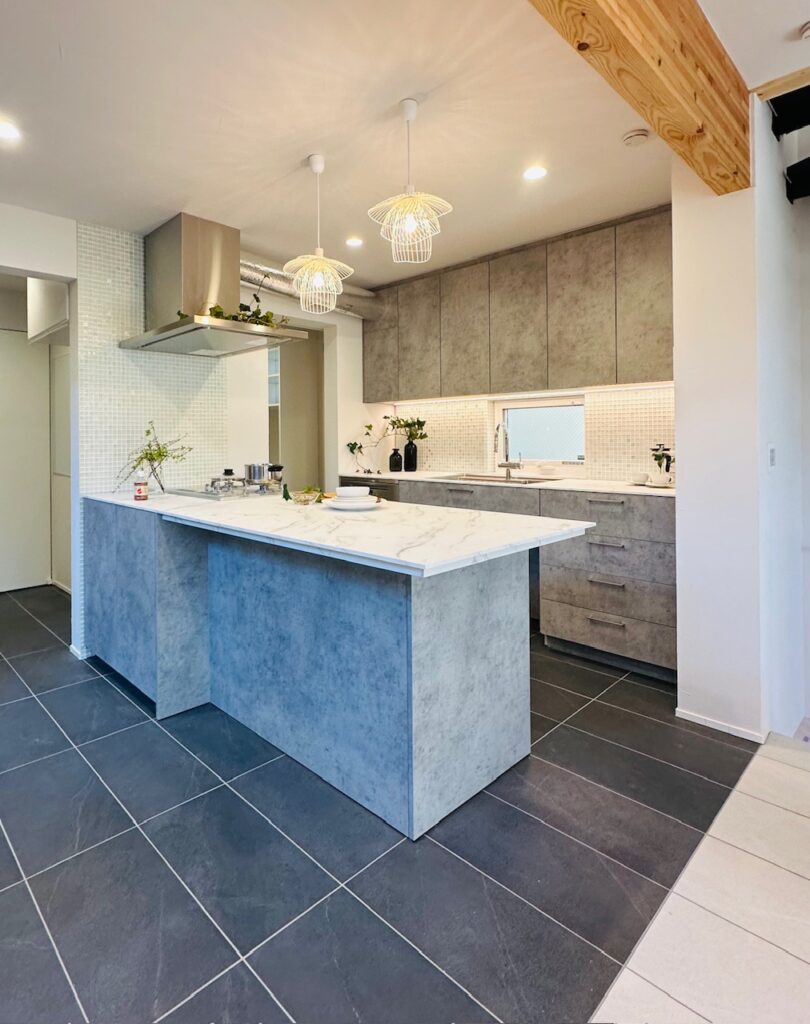 テレワーク用の書斎⇔目隠しされたバルコニー(外干し)⇔Ⅱ型キッチン⇔パントリー⇔洗濯+幹太君(室内干し)⇔洗面その他水回りはすべて回遊動線でつながり、共働きご夫婦が少しでも家事が楽になるようにプランニングしました。仕事、家事、息抜きと回遊しながら楽しくこなせるように!!