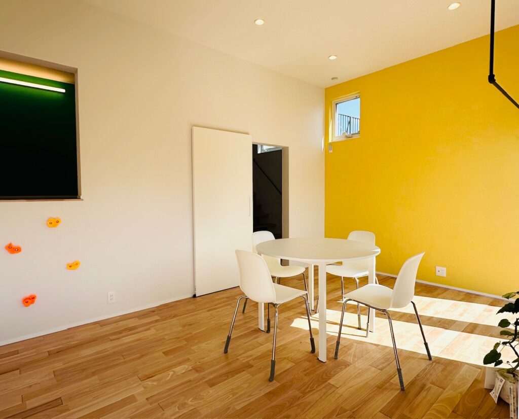 わんぱく3兄弟のための幅が5メートル超の勉強デスクがあるホールの様子