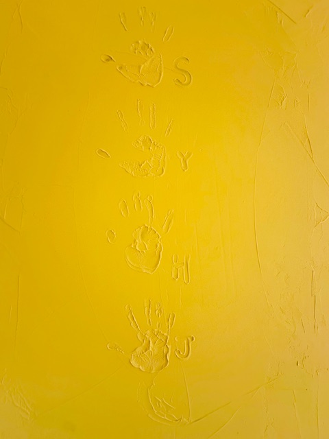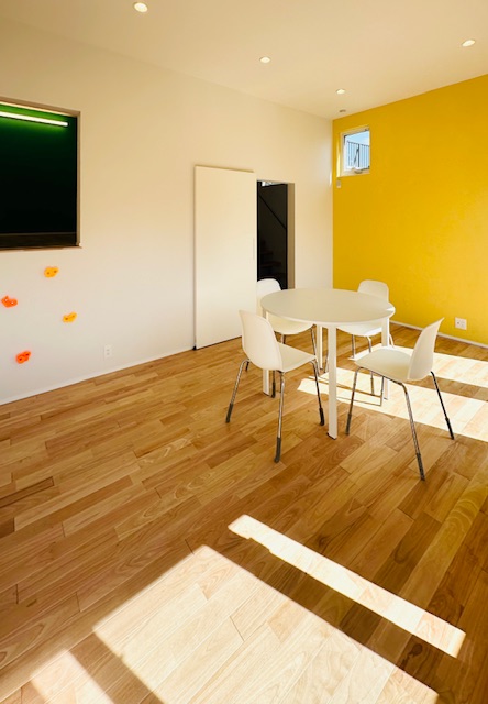 この家の住人たちによる左官塗り仕上げ中の様子!! 調湿性のある仕上げ材を採用し、個室のアクセント壁面を全部仕上げるという大仕事。左官やさんの手ほどきを受け、この家のかわいい三兄弟+従兄弟たちで仕上げました!
