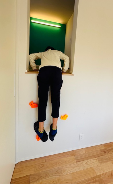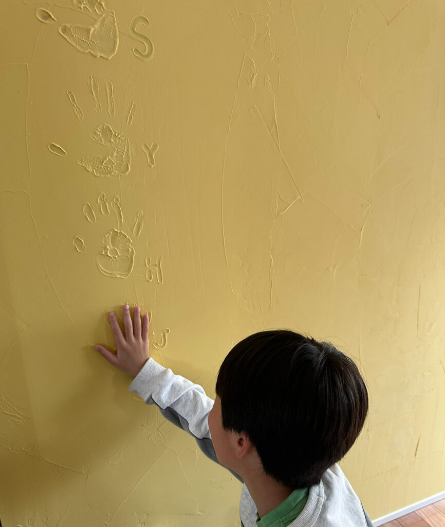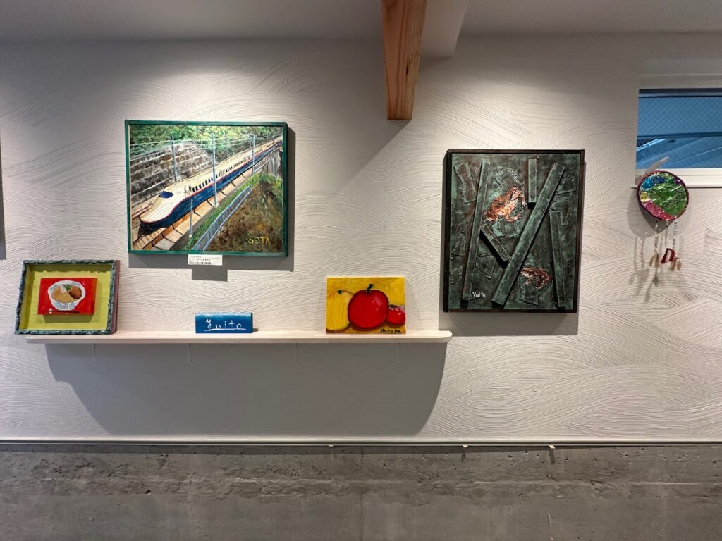 1階のエントランスホールは塗り壁のパターンを変えてこどもギャラリー 3兄弟みんながアトリエに通って力作ばかり!!