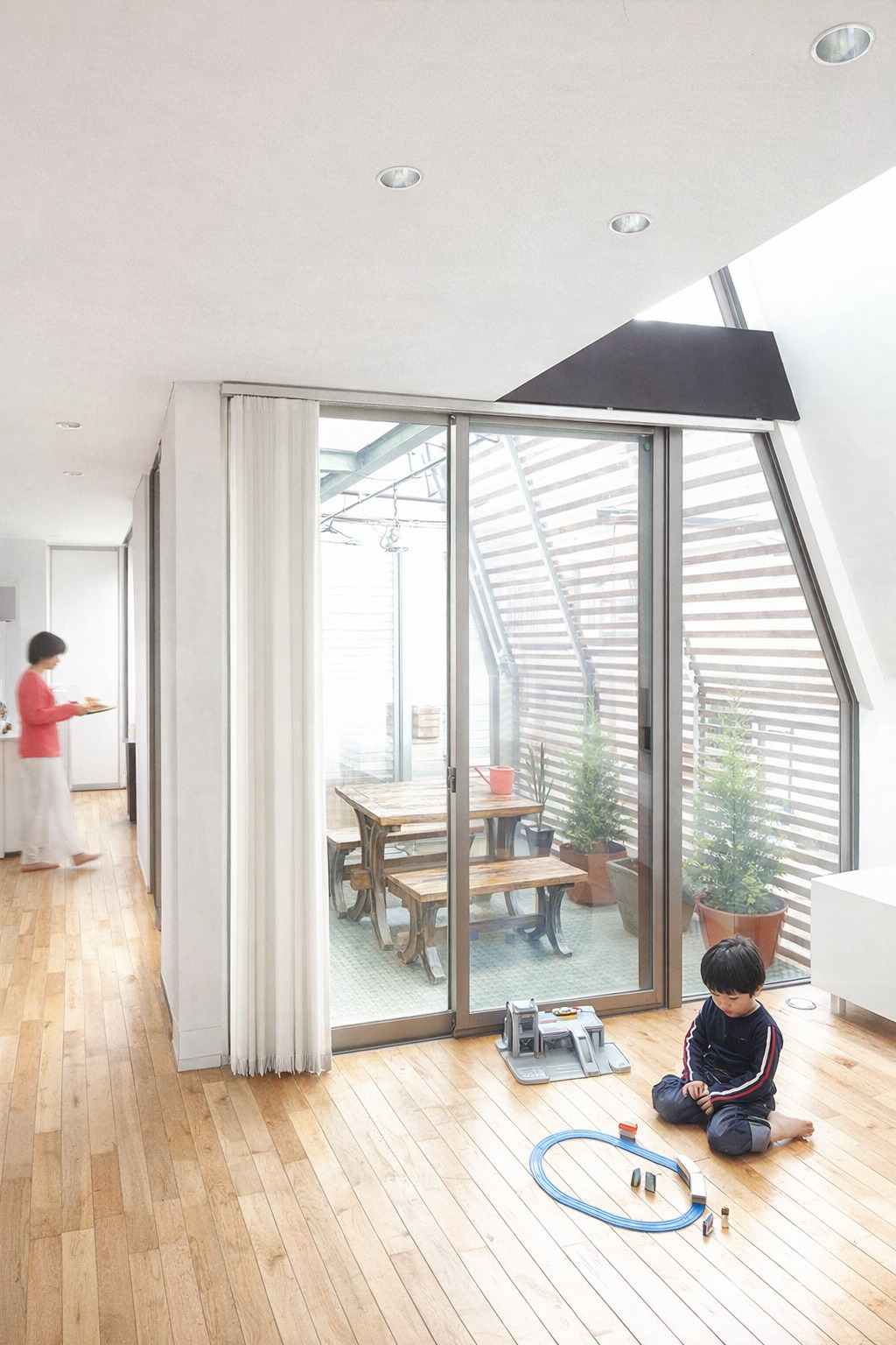 テラスを挟んでダイニングとリビングが配置されている、テラスやトップライトから光が降り注ぐ為明るく、窓越しに家族の姿が確認できる。仕切りをなるべくなくし、住まい全体を一体空間にした