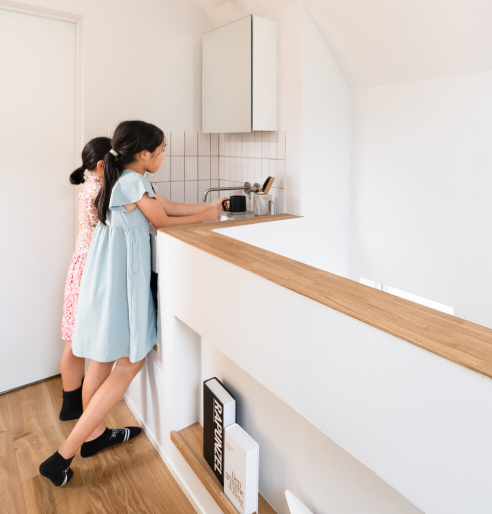 2階のLDKから見上げると吹き抜けを通して3階にある2つの個室の様子やそれらを結ぶ渡り廊下が見え、上階の子どもたちの様子が何となく見えて、家族のつながりを感じられる計画とした