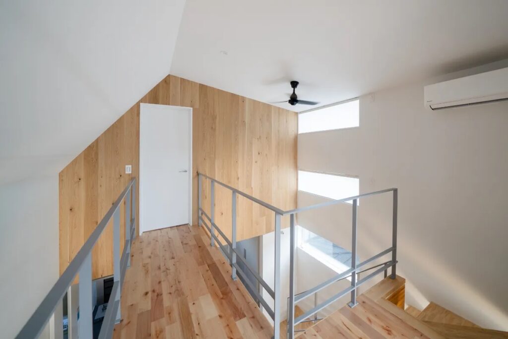 2階には道路からプライバシーが確保された目隠し壁で囲われた陽当たりの良いバルコニースペースを提案しました。このバルコニーと視覚的に連続するLDKを設置し、家族が集まる住まいの中心とした。LDKの一部は吹抜けがあり高窓からの採光、通風など確保しました。