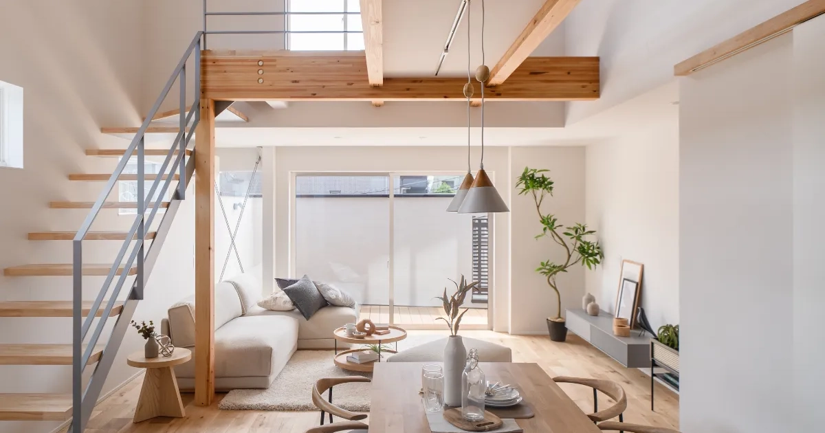 2階リビングと上部の火災に強い準耐火建築物でありながら梁や柱の一部を現し、無垢の床板貼や室内壁にも板を張り、内部は全て塗り壁の自然素材にこだわって仕上げています。