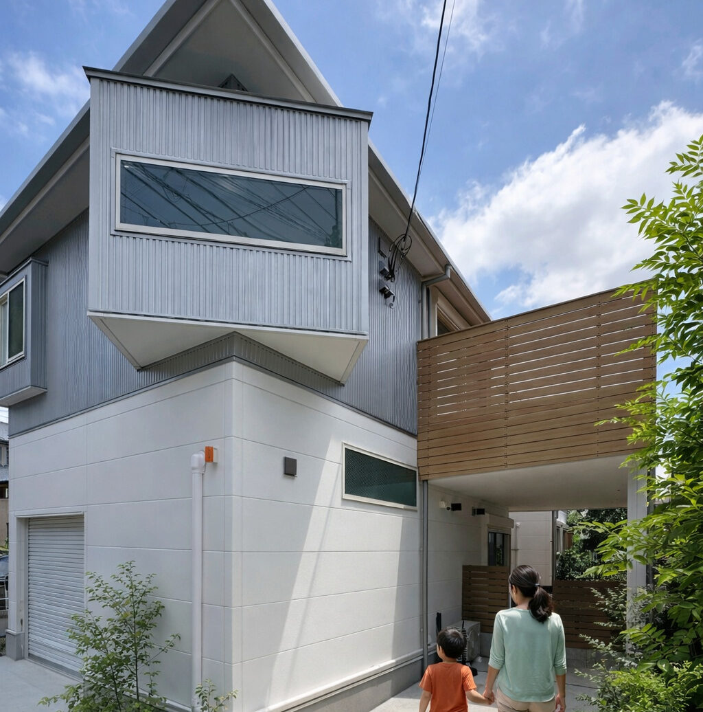 大田区で完成した二世帯住宅ビルトインガレージ付き方形屋根の家