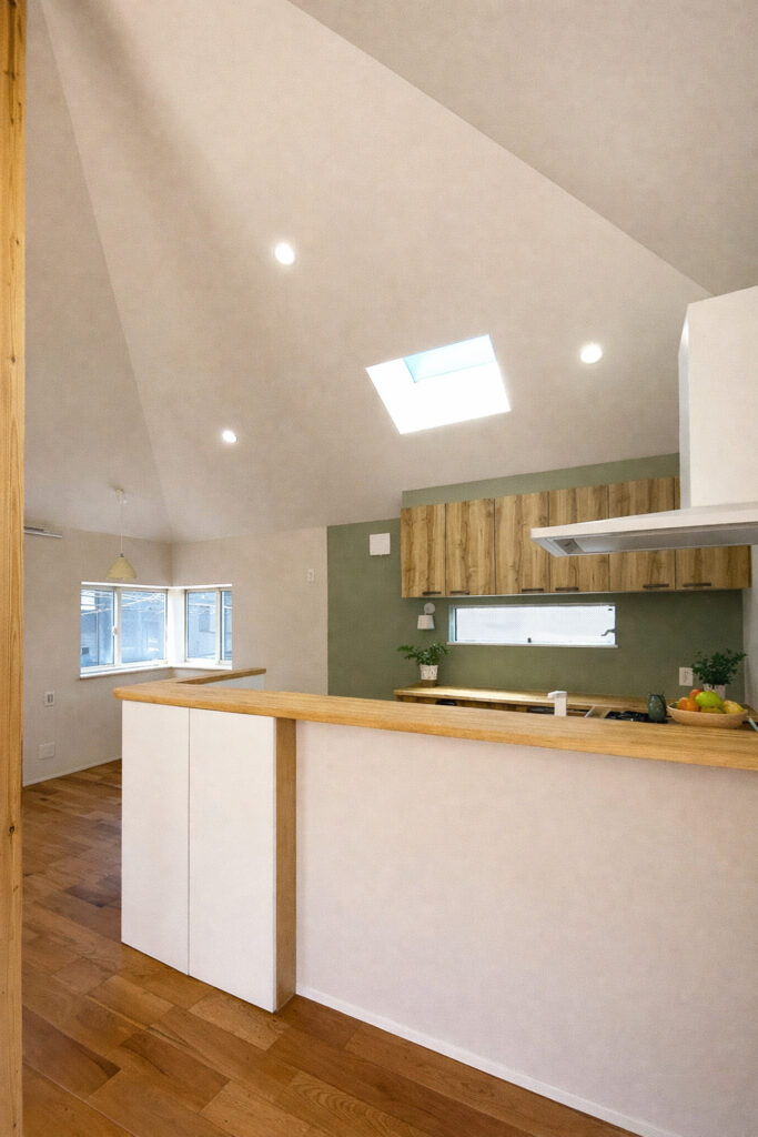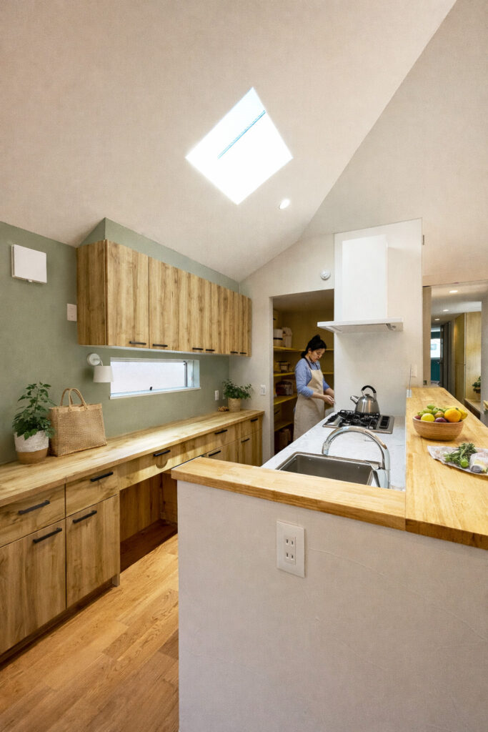 キッチンは家具屋さん製作による 自分の好きな設備を組み込んだオーダーキッチン 奥にはパントリーも併設
