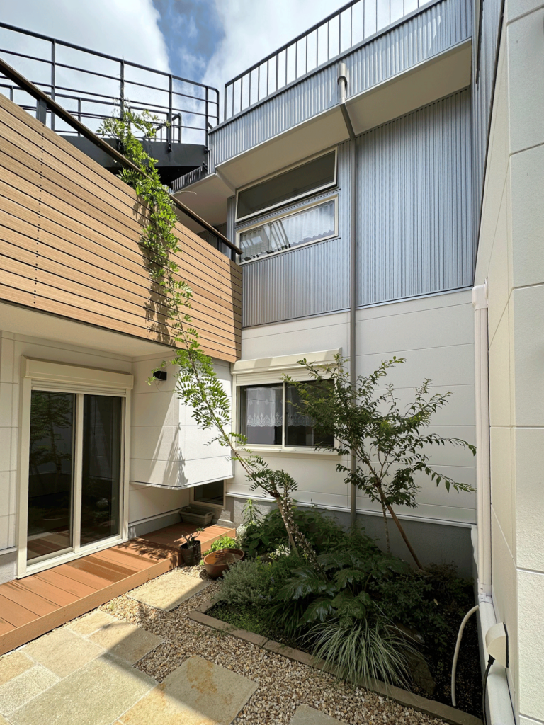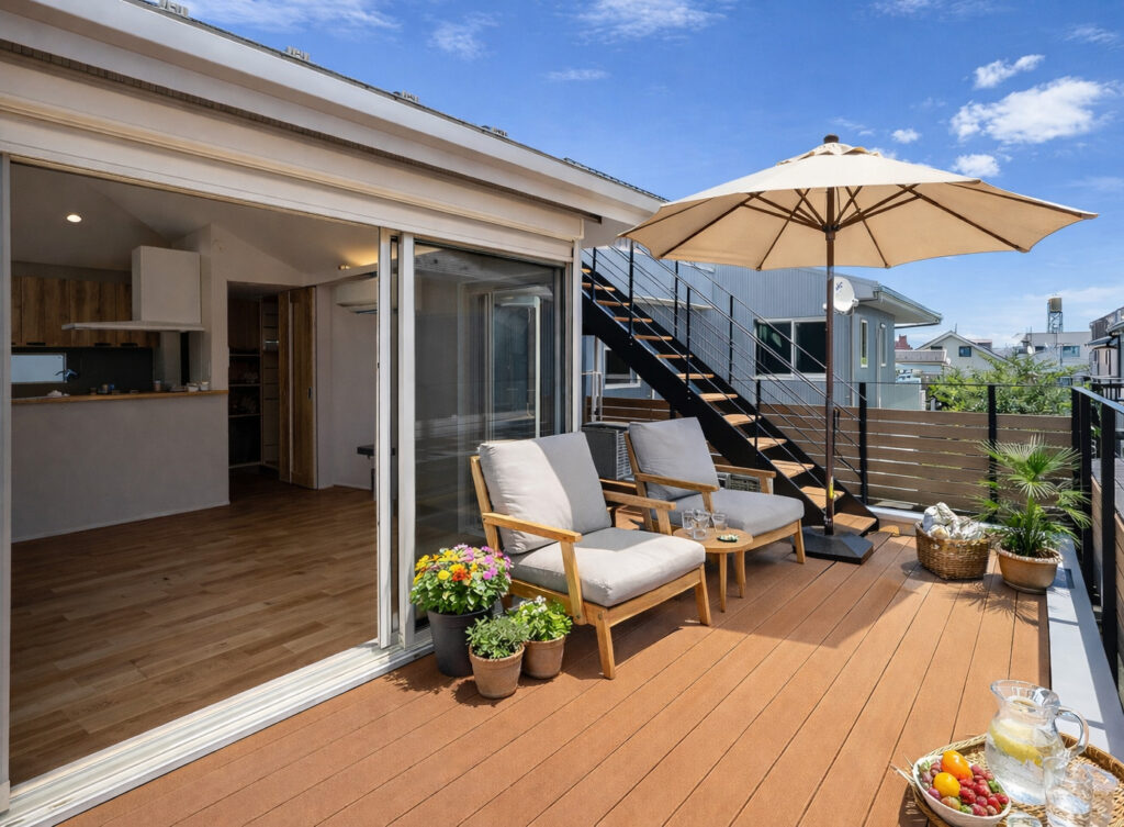 黒い鉄製階段でウッドデッキバルコニーは屋上へもつながる