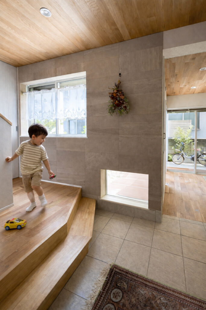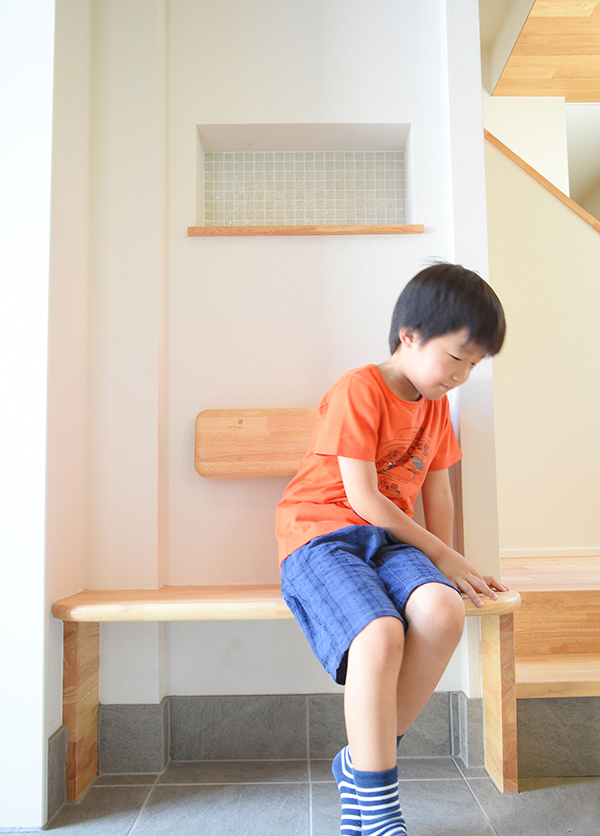 ベンチもある玄関ホールの様子。奥に中庭がちらっと見えております。桜に紫陽花など四季折々の花が植えられている。タイルに本物の木にしっくい塗り壁にと仕上げにもこだわっております。